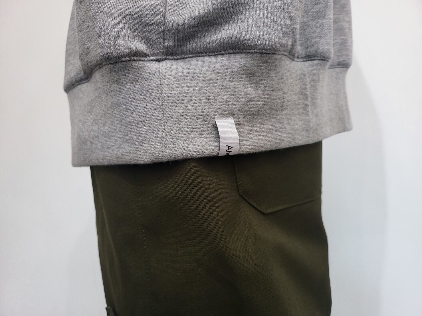 裾のリブにブランドのネームタグを付けてワンポイントにし、シンプルなアイテムにアクセントを付けています。