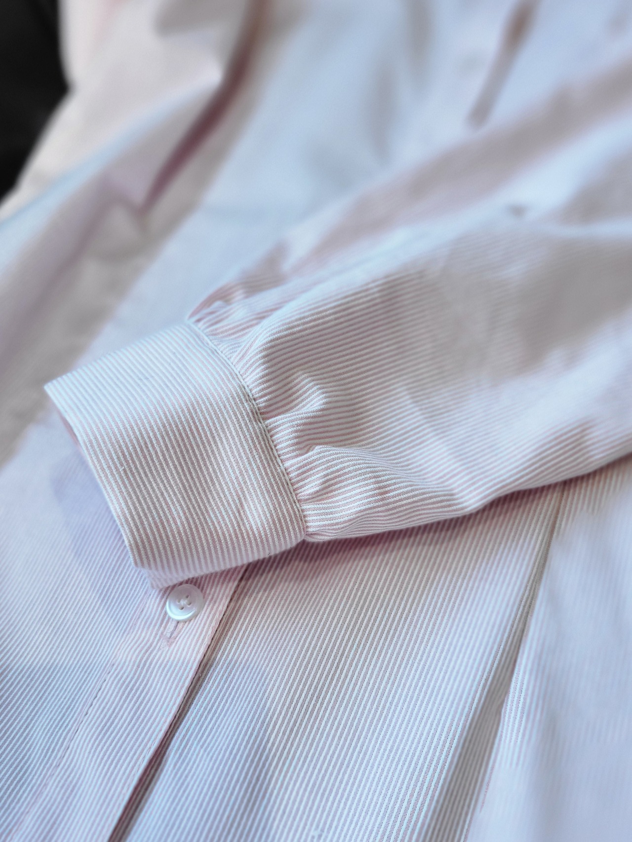 スリッドを深く入れており、動きのあるシャツワンピースになっています。丸みのある裾が女性らしさをアップさせます